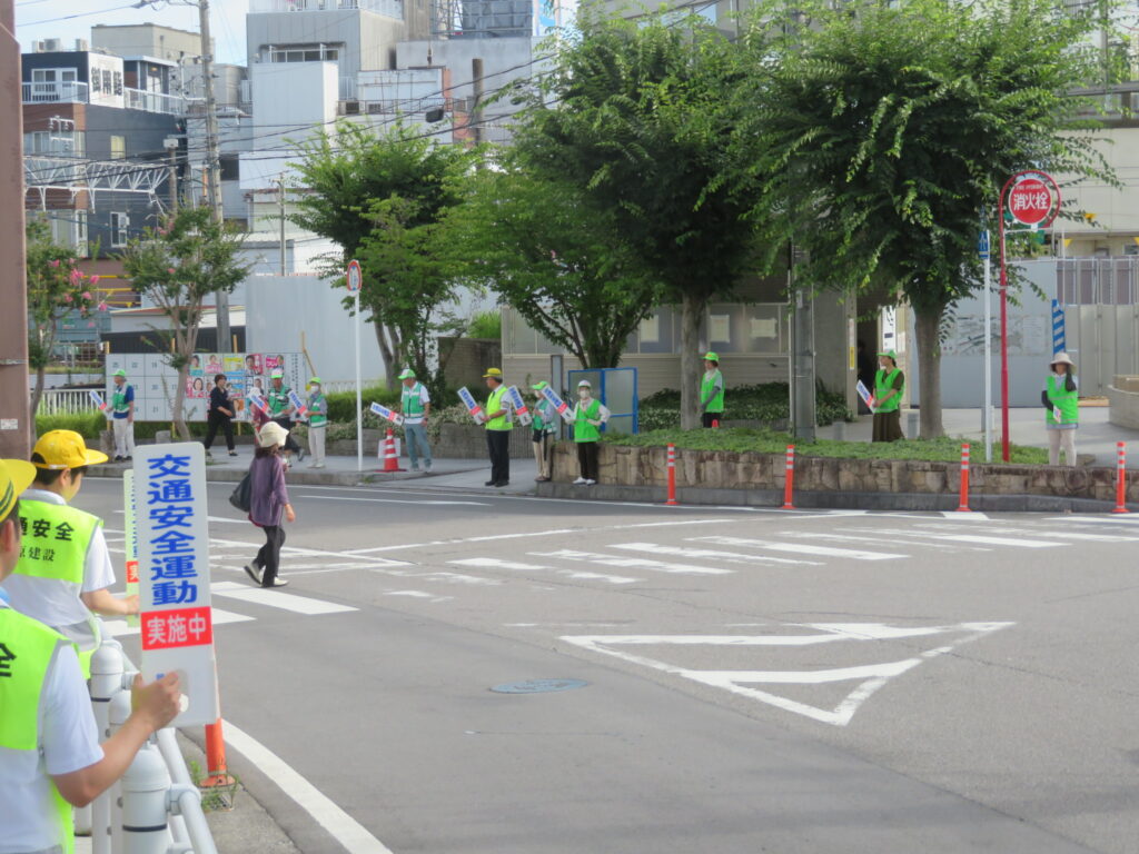夏の交通安全県民運動の初日、岡崎市の玄関口である名鉄東岡崎駅南口のおいて、小原建設㈱はじめ当協議会員と地元住民、岡崎市、岡崎警察署(加藤署長はじめ3名)も参加し、