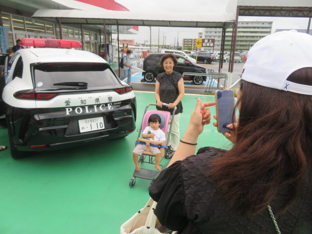 愛知県警の広報車「トヨタクラウンスポーツパトカー」の周りには、多くの来店客が集まり、親子連れの皆さんが記念撮影などをして楽しまれました。