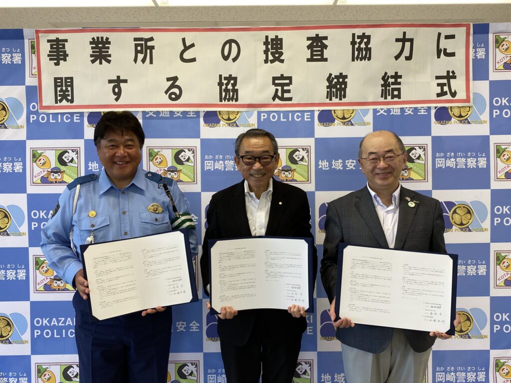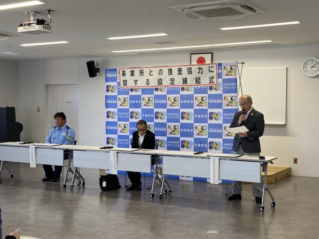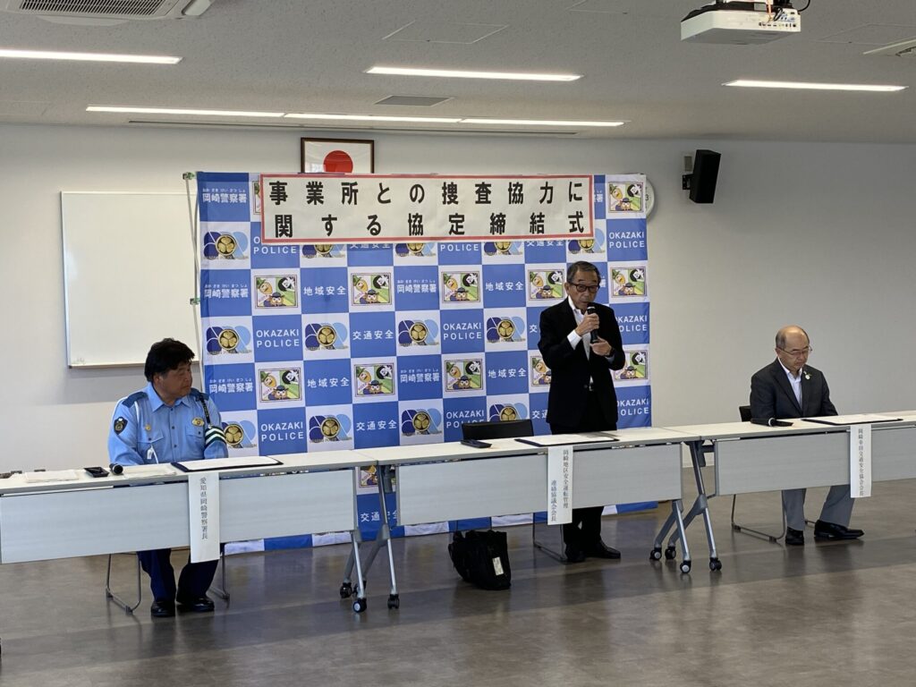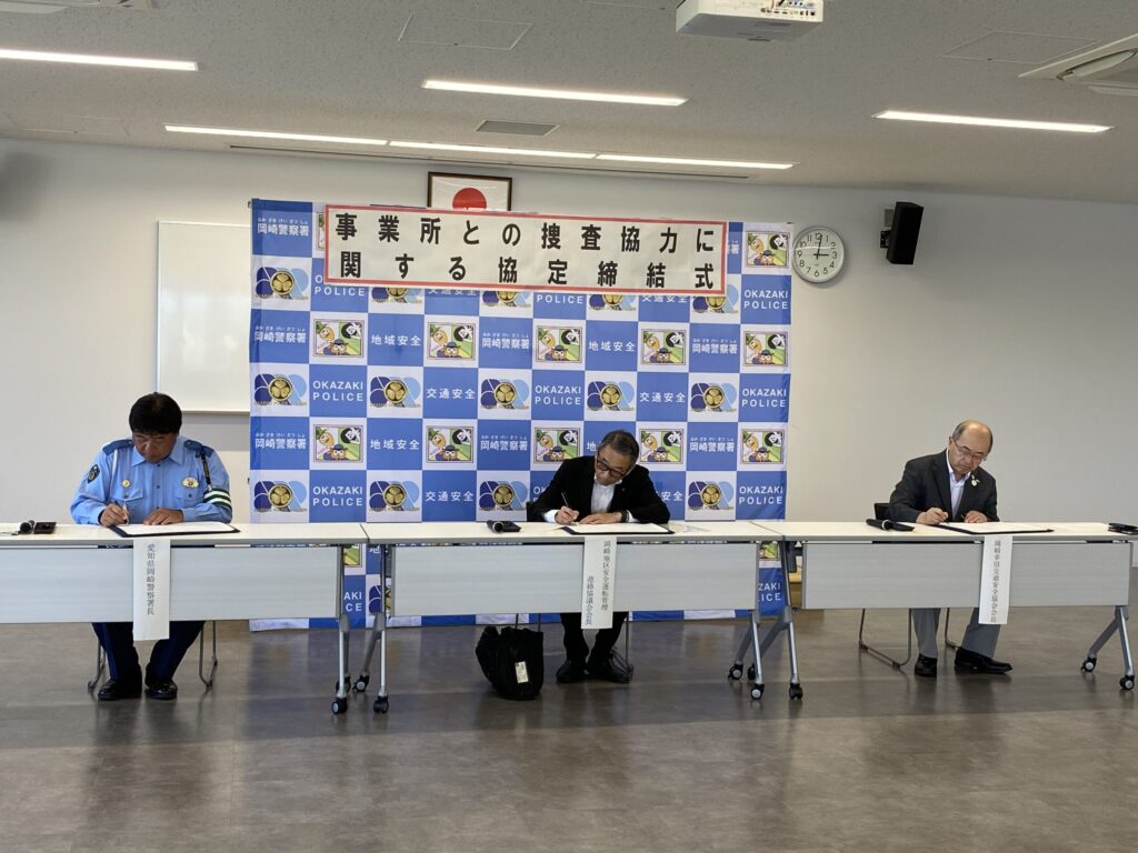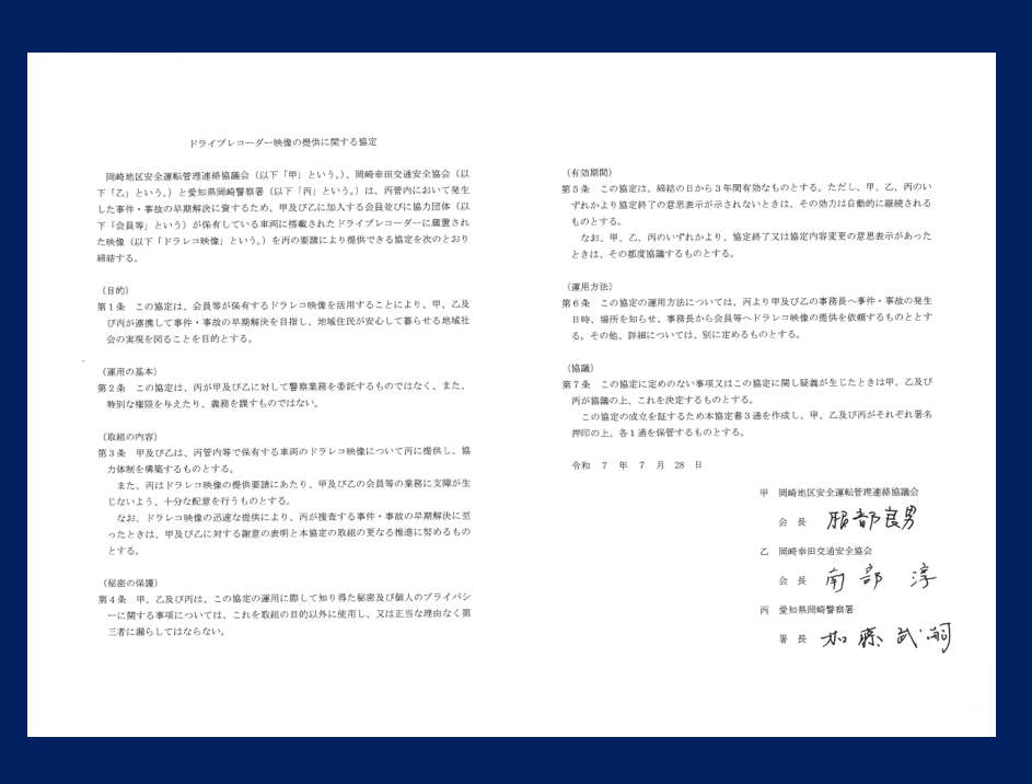 当協議会は、岡崎幸田交通安全協会及び愛知県岡崎警察署と連携し、各種事件・事故の未然防止や解決に役立てるため、各団体の会員事業所が管理する車両のドライブレコーダー 映像(以下 「ドラレコ映像」という。)を迅速に活用できるようドラレコ映像の提供に関する協定を締結しました。
