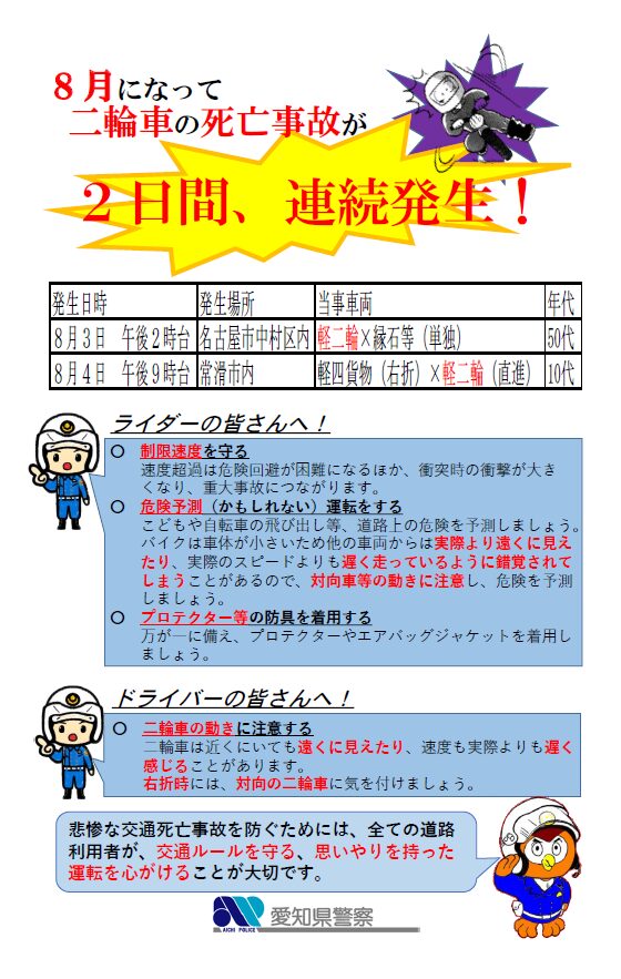 R7.8.5二輪車交通死亡事故連続発生注意喚起チラシ