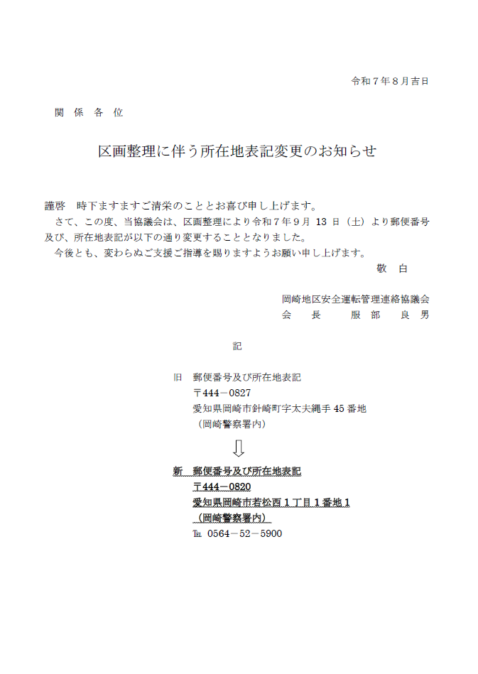 岡崎地区安全運転管理連絡協議会の所在地が区画整理に伴い、令和7年9月13日(土)より変更になります。※電話番号は変更ありません。