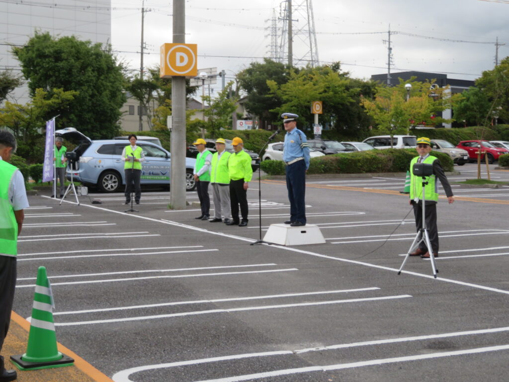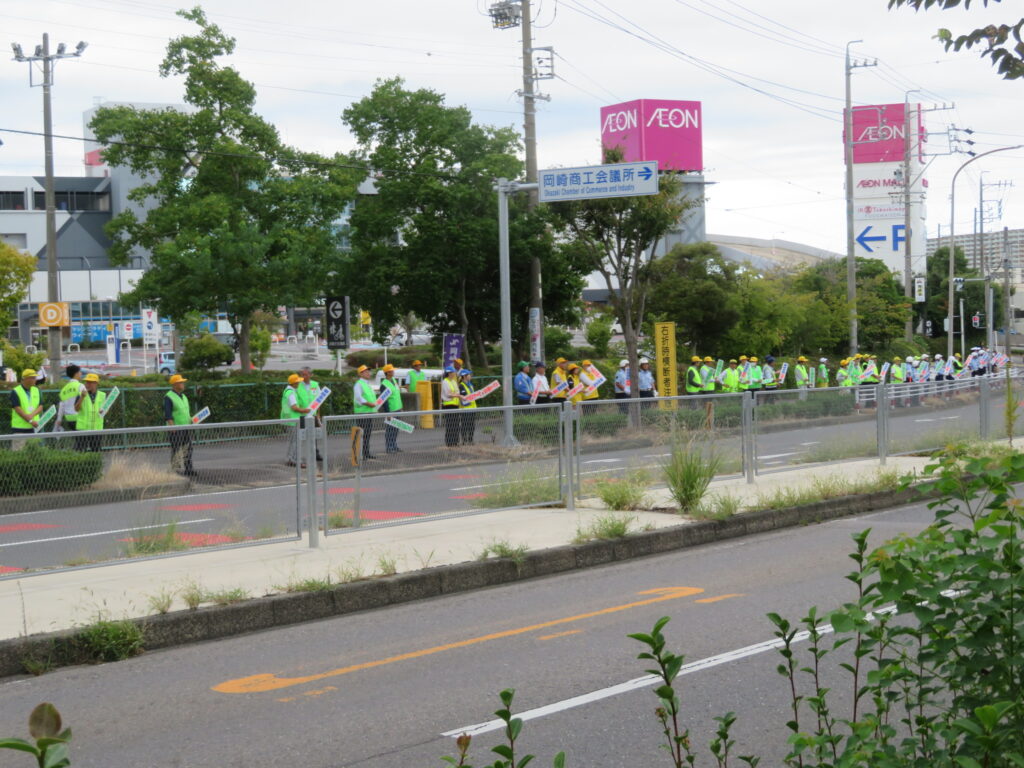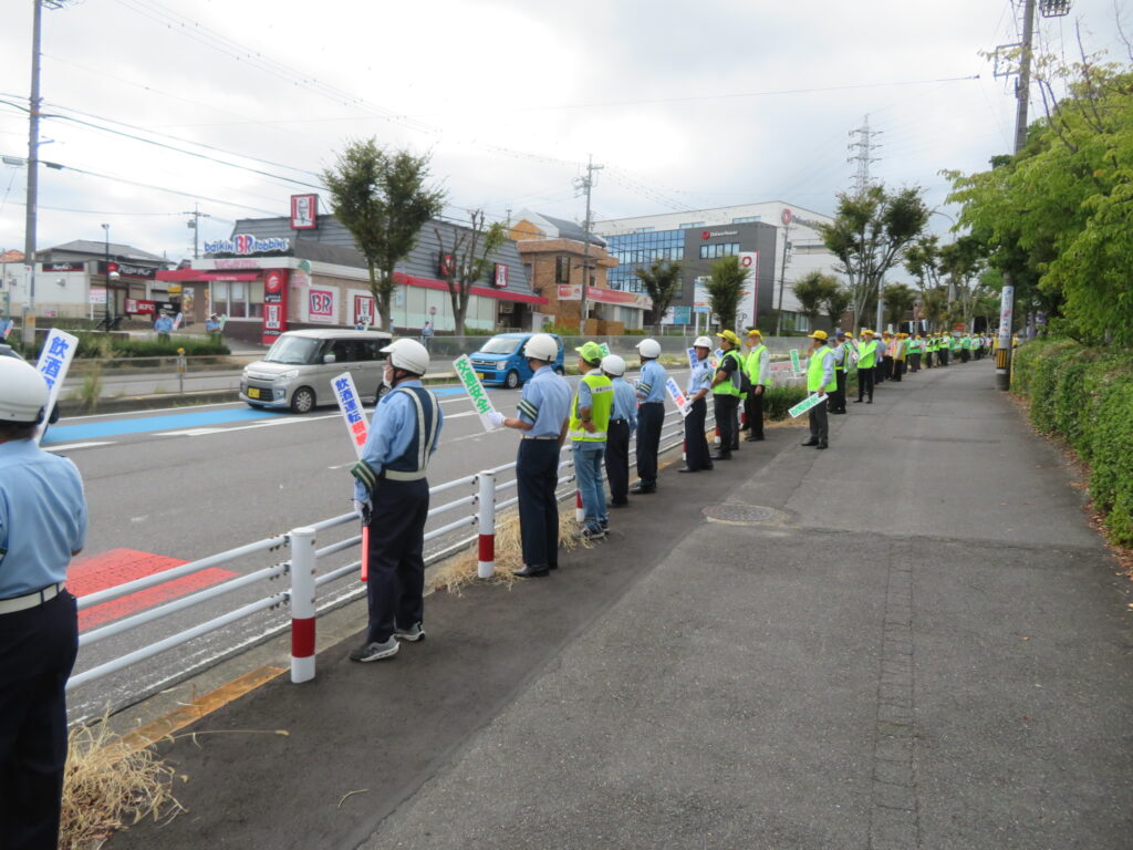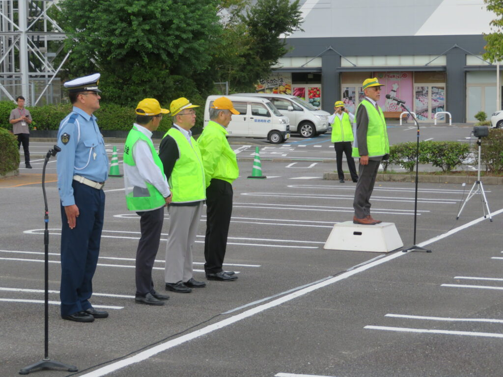 開始式では、岡崎警察署稲垣交通課長から、「岡崎警察署管内の交通死亡事故は、現在3名と昨年よりも減少しているものの、管内では、年末に向けて交通死亡事故が多発する傾向にあります。また、秋の季節は、日没時刻が早くなり『5~7は、魔の時間』(午後5時から午後7時は、魔の時間)と言われます。自動車は、   ライトの早めの点灯、ハイビームの活用を歩行者は、 反射材や明るい服装を着用し交通事故防止に.努めましょう。 本日は、早朝から大勢の方にご参加をいただきました。みんなの力(官民力)を合わせて、交通事故をなくしましょう。」と参加者に呼びかけました。