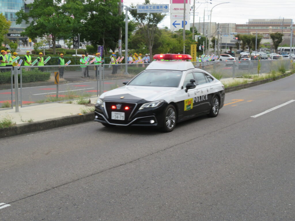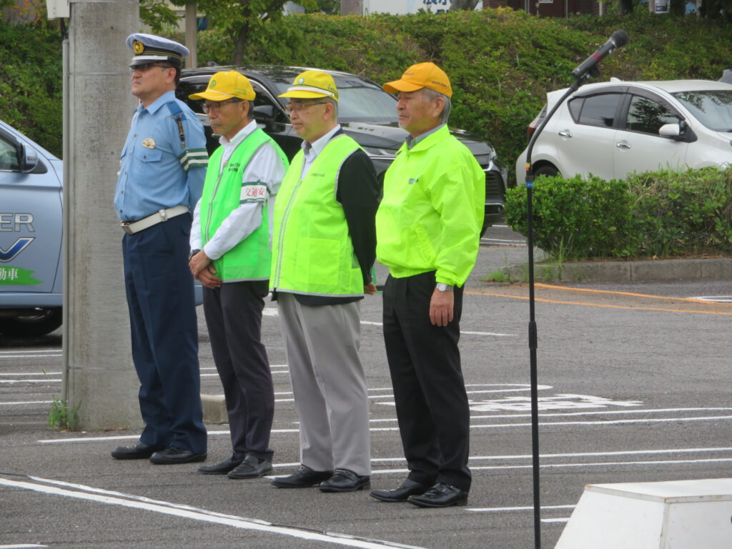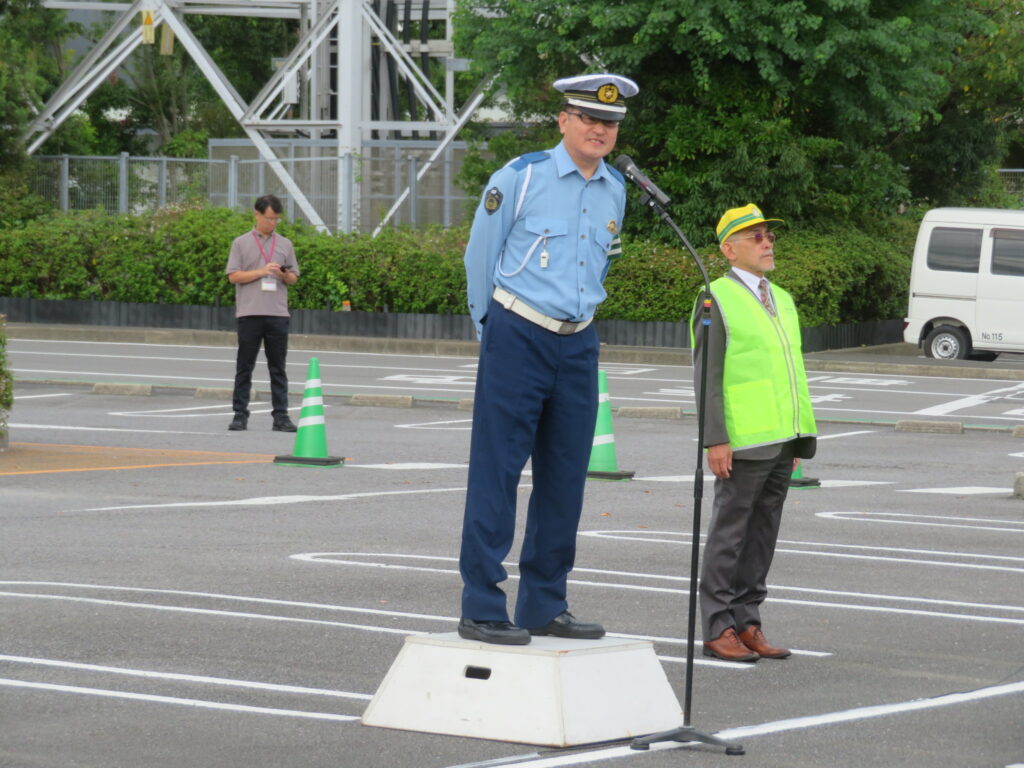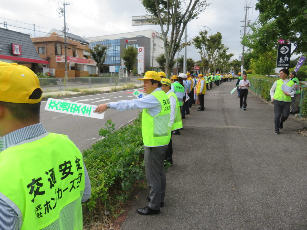 開始式では、岡崎警察署稲垣交通課長から、「岡崎警察署管内の交通死亡事故は、現在3名と昨年よりも減少しているものの、管内では、年末に向けて交通死亡事故が多発する傾向にあります。また、秋の季節は、日没時刻が早くなり『5~7は、魔の時間』(午後5時から午後7時は、魔の時間)と言われます。自動車は、   ライトの早めの点灯、ハイビームの活用を歩行者は、 反射材や明るい服装を着用し交通事故防止に.努めましょう。 本日は、早朝から大勢の方にご参加をいただきました。みんなの力(官民力)を合わせて、交通事故をなくしましょう。」と参加者に呼びかけました。