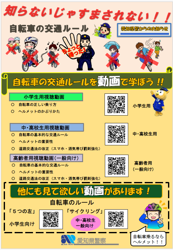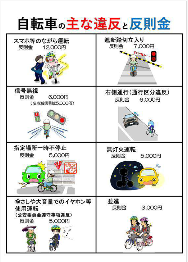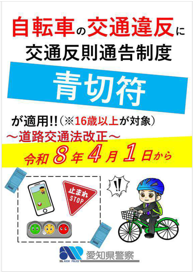 令和8年4月1日から(道路交通法の一部改正)自転車の交通違反に交通反則通告制度(青切符)が適用(※16歳以上が対象)となります。通勤や通学をはじめ皆さんの身近な日常の「足」として使われる自転車、この自転車の交通違反が交通反則制度の対象となります。下記のチラシを職場や家庭でご活用をいただき、交通安全や交通事故防止にお役立てください。
