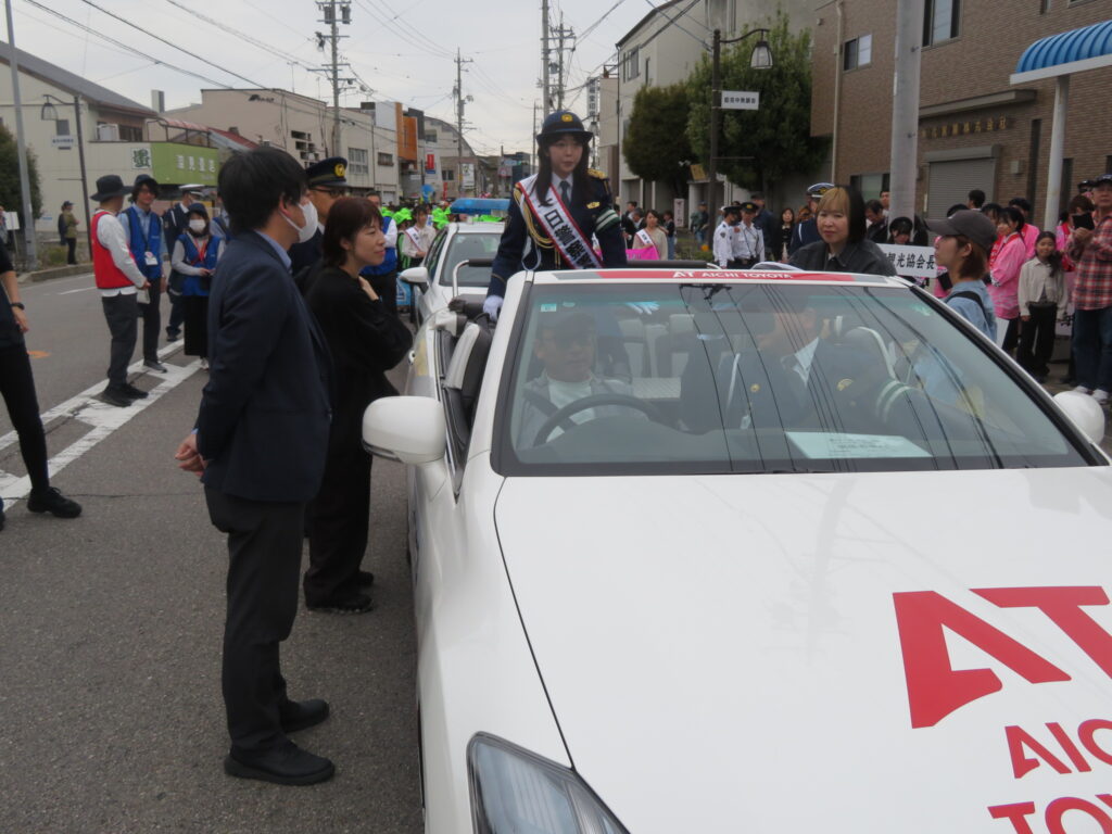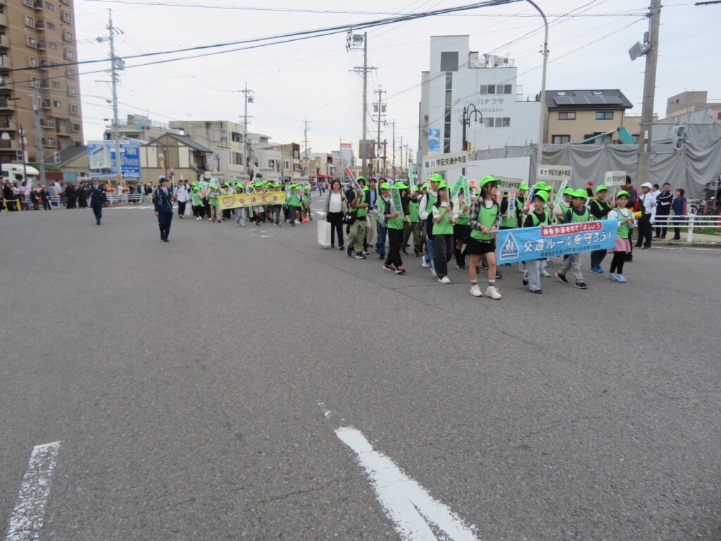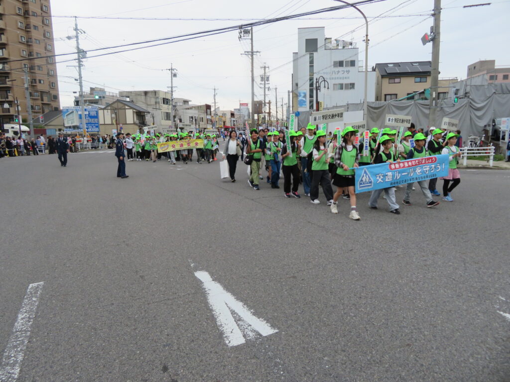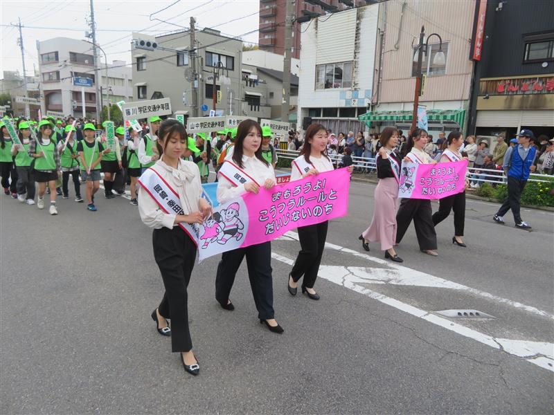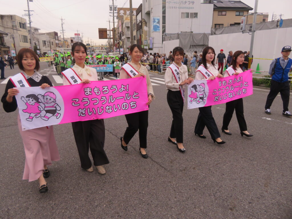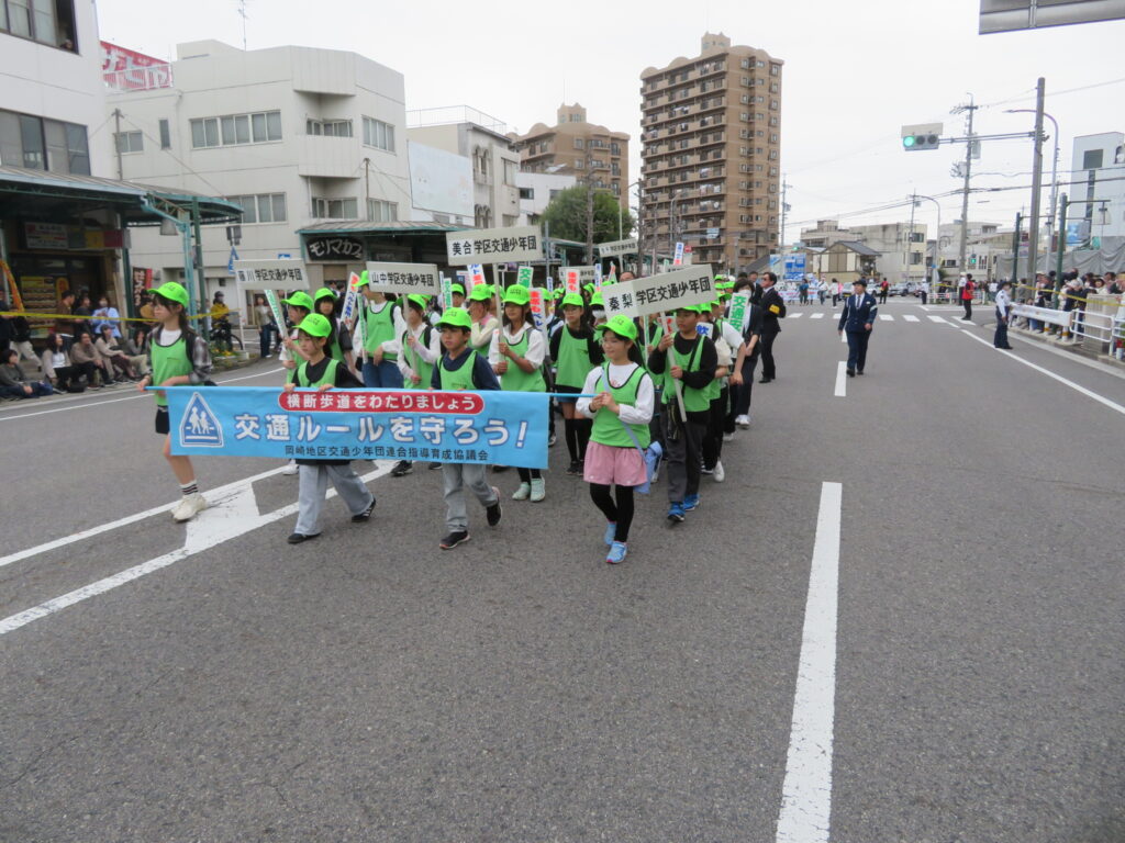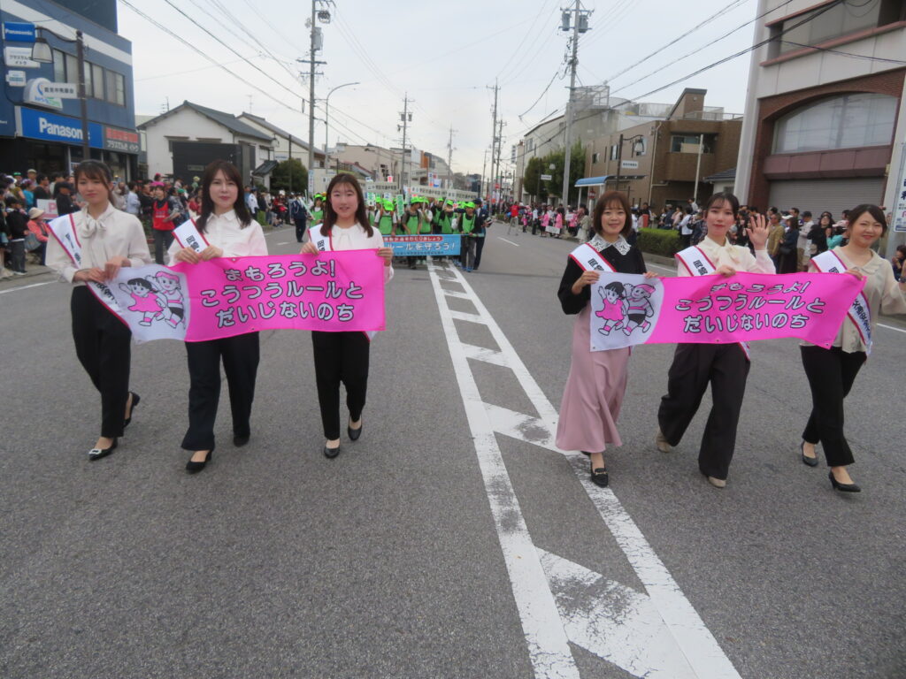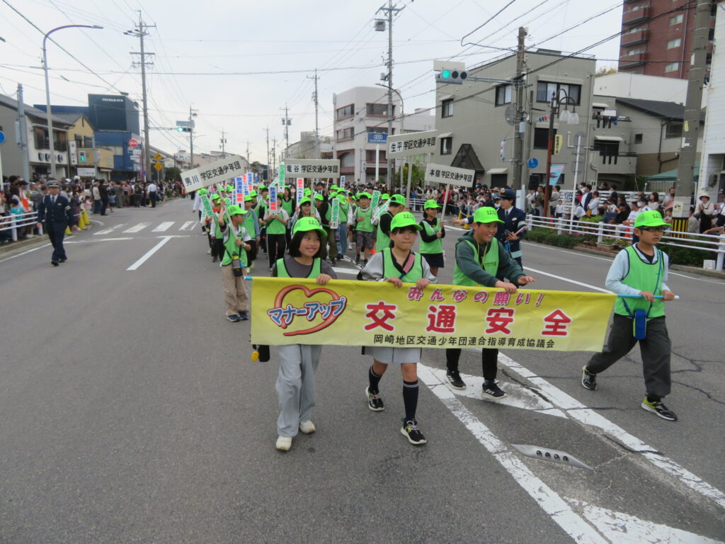 「岡崎・幸田交通安全大使」・「交通安全少年団」が、交通安全の横断幕やハンドプレート等を手にし、沿道の岡崎市民はじめ愛知県民に、笑顔や手振りで、交通安全を呼びかけました。