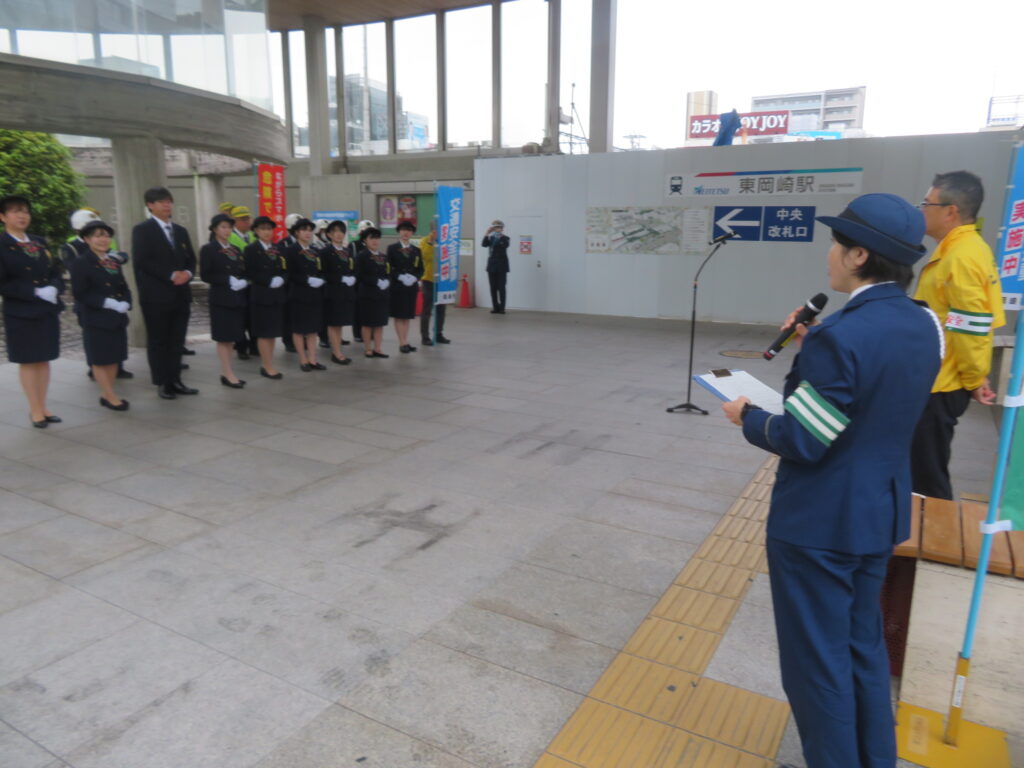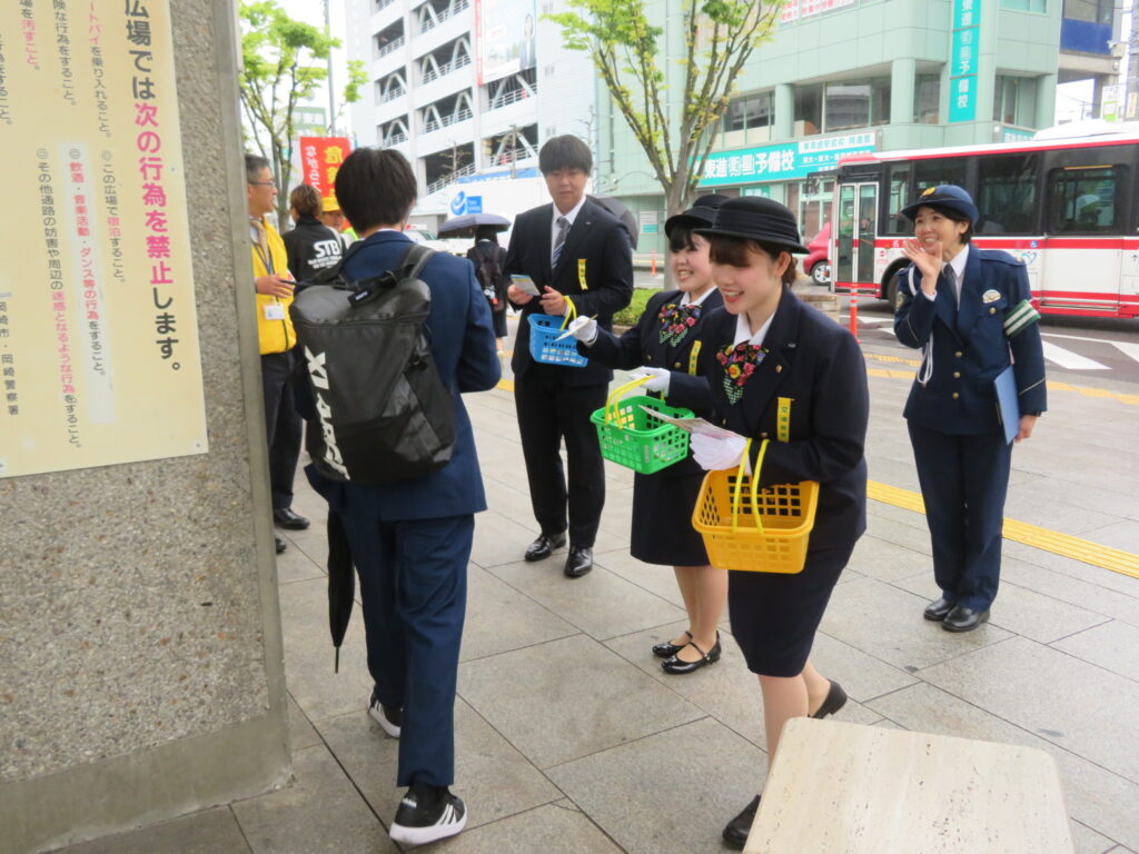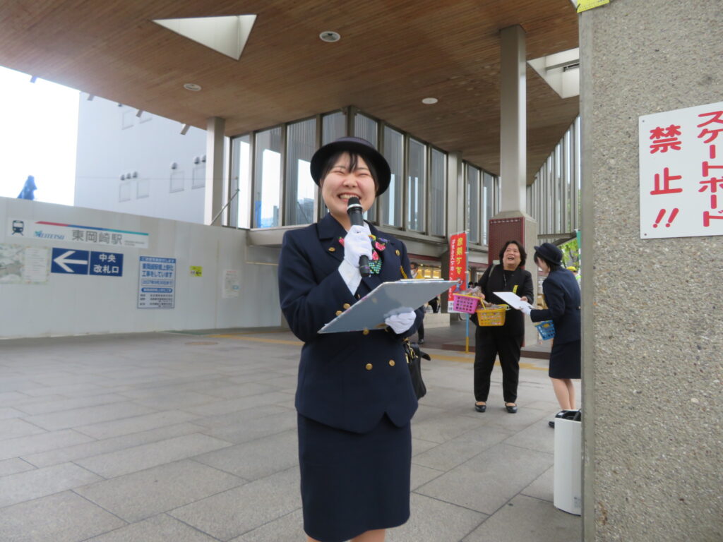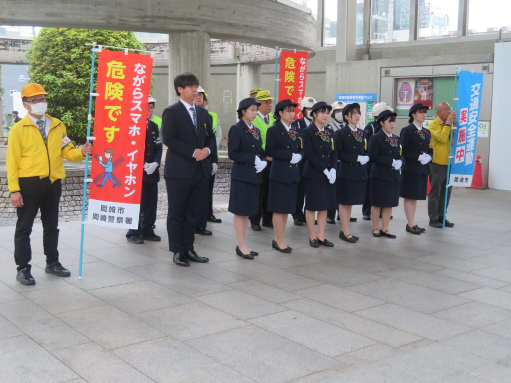 春の全国交通安全運動の一環として、名鉄東岡崎駅前において、名鉄観光バス(株)新人バスガイドや新人運転手をはじめ交通安全関係団体が合同で通勤・通学等の駅利用者を対象とした交通安全キャンペーンを.開催しました。
