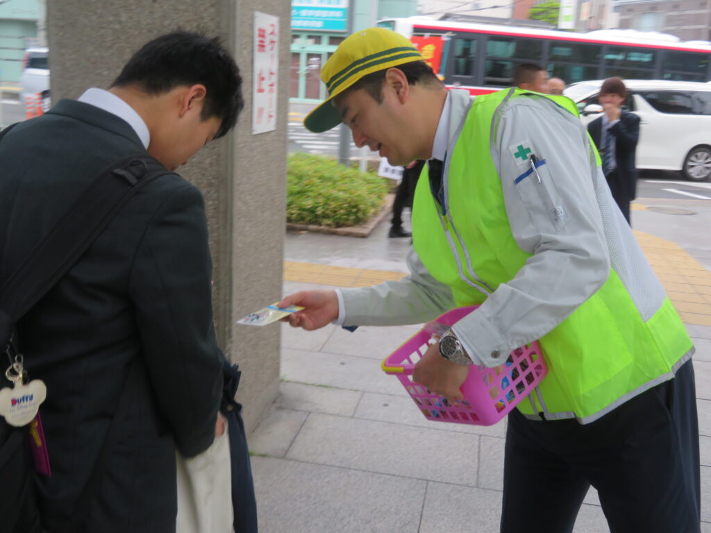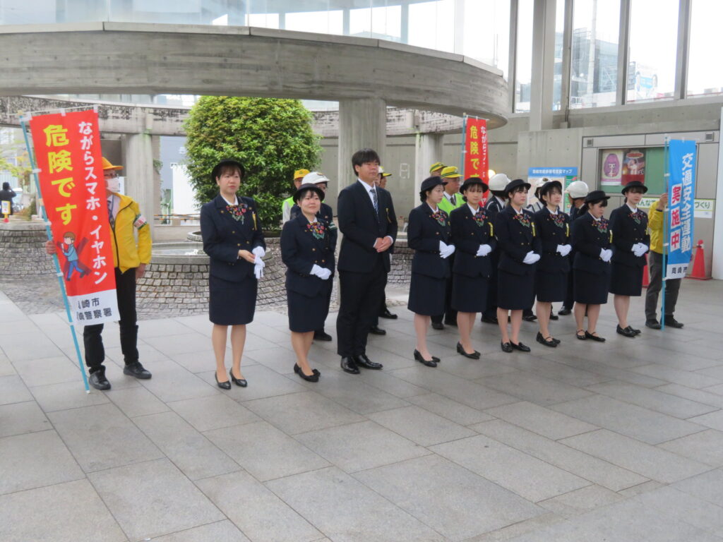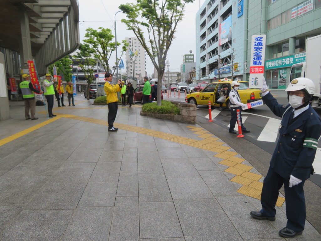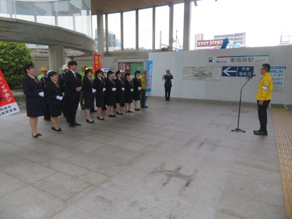 春の全国交通安全運動の一環として、名鉄東岡崎駅前において、名鉄観光バス(株)新人バスガイドや新人運転手をはじめ交通安全関係団体が合同で通勤・通学等の駅利用者を対象とした交通安全キャンペーンを.開催しました。